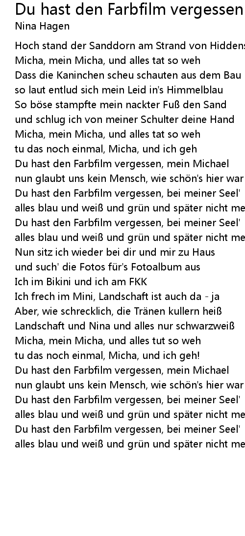 Du hast den farbfilm vergessen, mein michael, nun glaubt uns kein mensch, wie . Du hast den farbfilm vergessen, mein michael, nun glaubt uns kein mensch wie schön's. Lyrics of du hast den farbfilm vergessen by nina hagen: Micha, mein micha und alles tat so weh, tu das noch einmal, micha und ich geh. Lyrics to du hast den farbfilm vergessen by nina hagen.